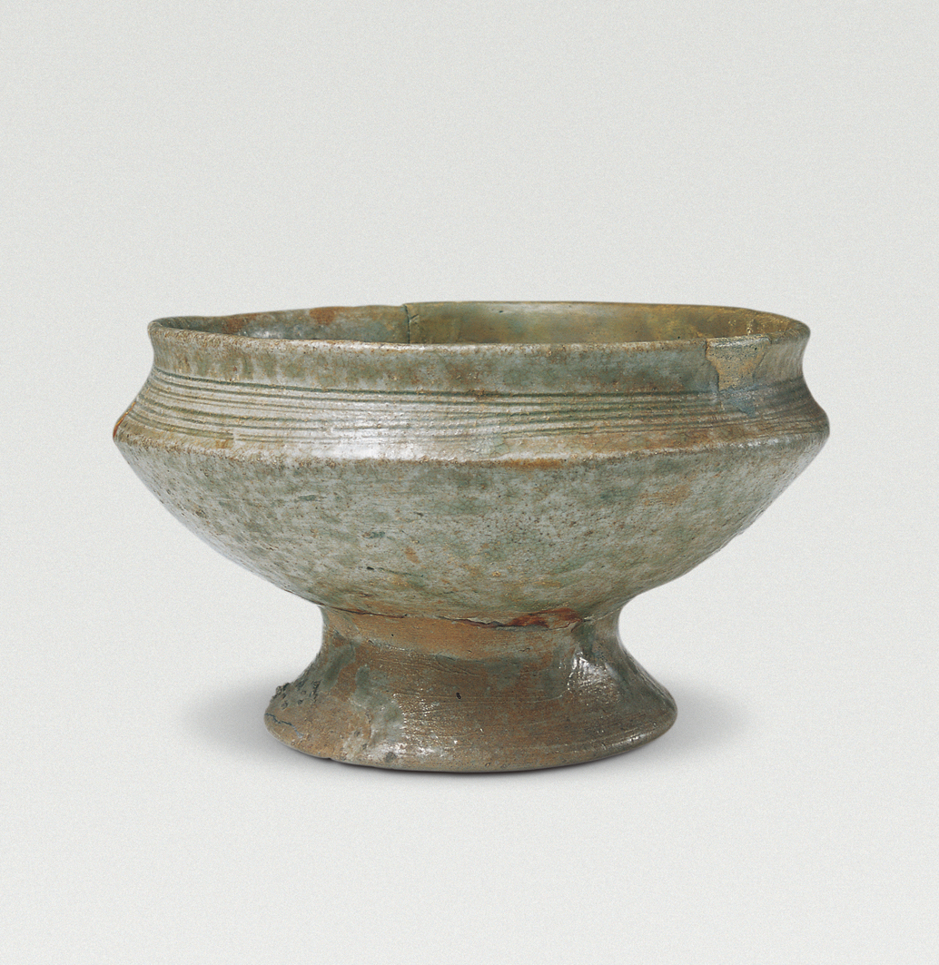 直口,折腹,腹下急收,喇叭形圈足。灰白色胎,器内外施青釉,釉层不匀,沿下以数道凹弦纹作装饰。