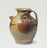 侈口外敞,束颈,溜肩,圆腹,平底。前有八棱短流,后置弓状把手,双系作龙形贴花。通体施釉,黄中泛绿,流及双系处的釉下加施褐色彩斑,整体造型浑圆饱满。湖南长沙窑烧造。