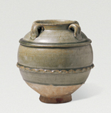 圆唇,矮颈,溜肩,鼓腹,圈足,肩部附四系。灰白胎,施青釉不及足。肩部饰凸弦纹,腹中部印饰花边状堆纹。
