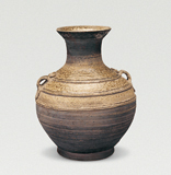 平折口,小口,溜肩,肩部有片状仿铜器造型的双耳,尖鼓腹,平底。胎体呈棕褐色,较粗而坚硬。青黄色釉,釉层厚而富有光泽,有明显的流淌现象,釉厚处呈青灰色并呈乳浊态,肩以上的部分施釉,下部露胎。肩部饰三道弦纹。(有学者认为此器的年代应属西汉。)
