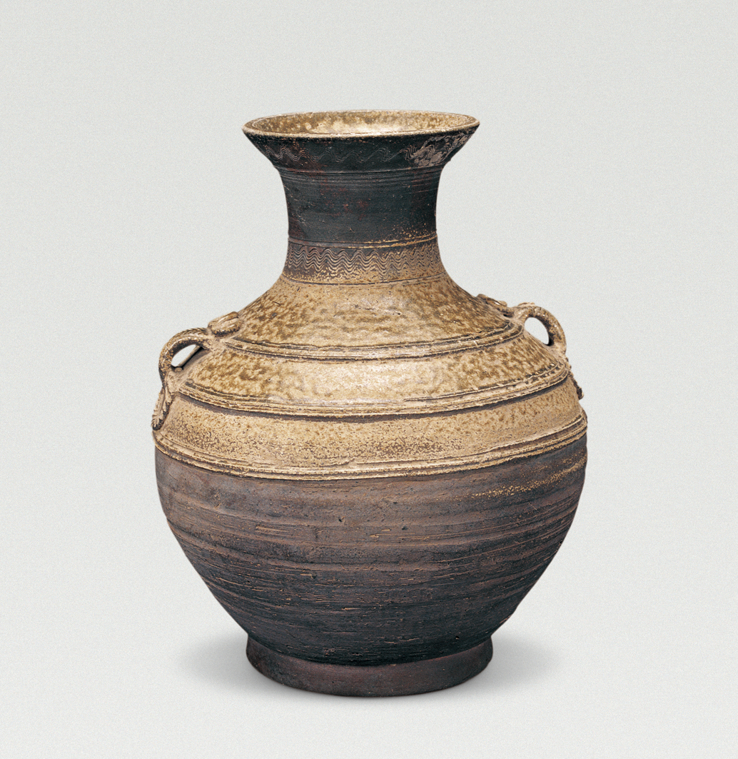 平折口,小口,溜肩,肩部有片状仿铜器造型的双耳,尖鼓腹,平底。胎体呈棕褐色,较粗而坚硬。青黄色釉,釉层厚而富有光泽,有明显的流淌现象,釉厚处呈青灰色并呈乳浊态,肩以上的部分施釉,下部露胎。肩部饰三道弦纹。(有学者认为此器的年代应属西汉。)