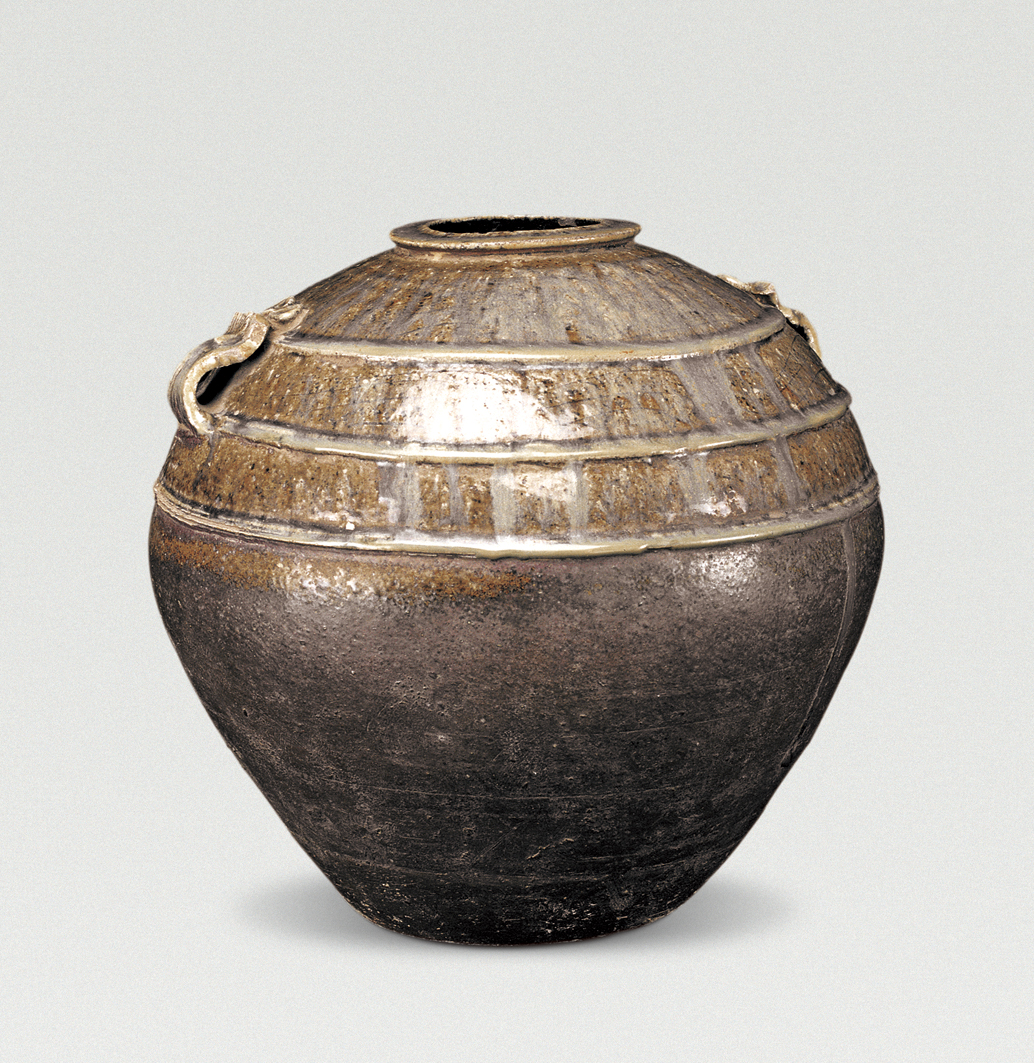 Proto-porcelain round belly jar with two loop-lugs
