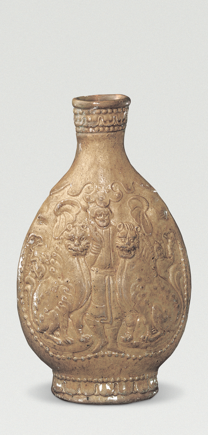 Yellow-glazed flask with mou-lded design of a foreigner with lions