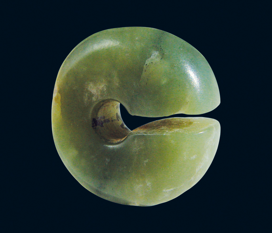 深绿色。器体呈璧状, 中孔较小, 自两面对钻而成。一侧有一道窄缺口, 两面光平, 外缘略外弧。通体抛光。
