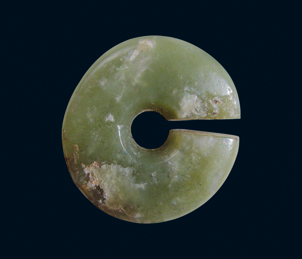 深绿色。器体呈璧状, 中孔较小, 自两面对钻而成。一侧有一道窄缺口, 两面光平, 外缘略外弧。通体抛光。