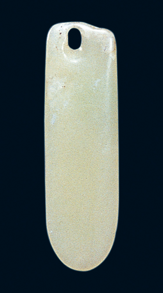 黄绿色。器体呈长条形, 通体抛光。顶端略凸, 两侧竖直, 一面光平, 另一面微鼓, 末端呈外凸弧形, 靠近顶端一侧有一个椭圆形小孔。