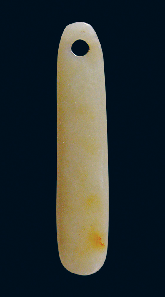 黄绿色, 夹杂红褐色沁斑。器体呈长条形, 顶端略窄, 呈外凸弧形, 两侧较直, 两面光平, 末端呈外凸弧形。