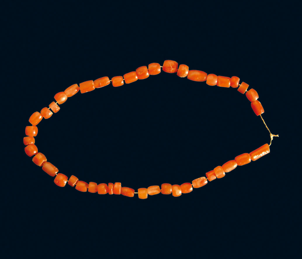 珠子呈棕红色, 半透明, 光泽甚佳。共43枚, 有枣核形、扁圆形和圆管形。其中多为圆管形珠, 两端截平, 中央穿孔一贯两端, 由两端孔径大于中间孔的特点看, 应为对钻法穿孔。