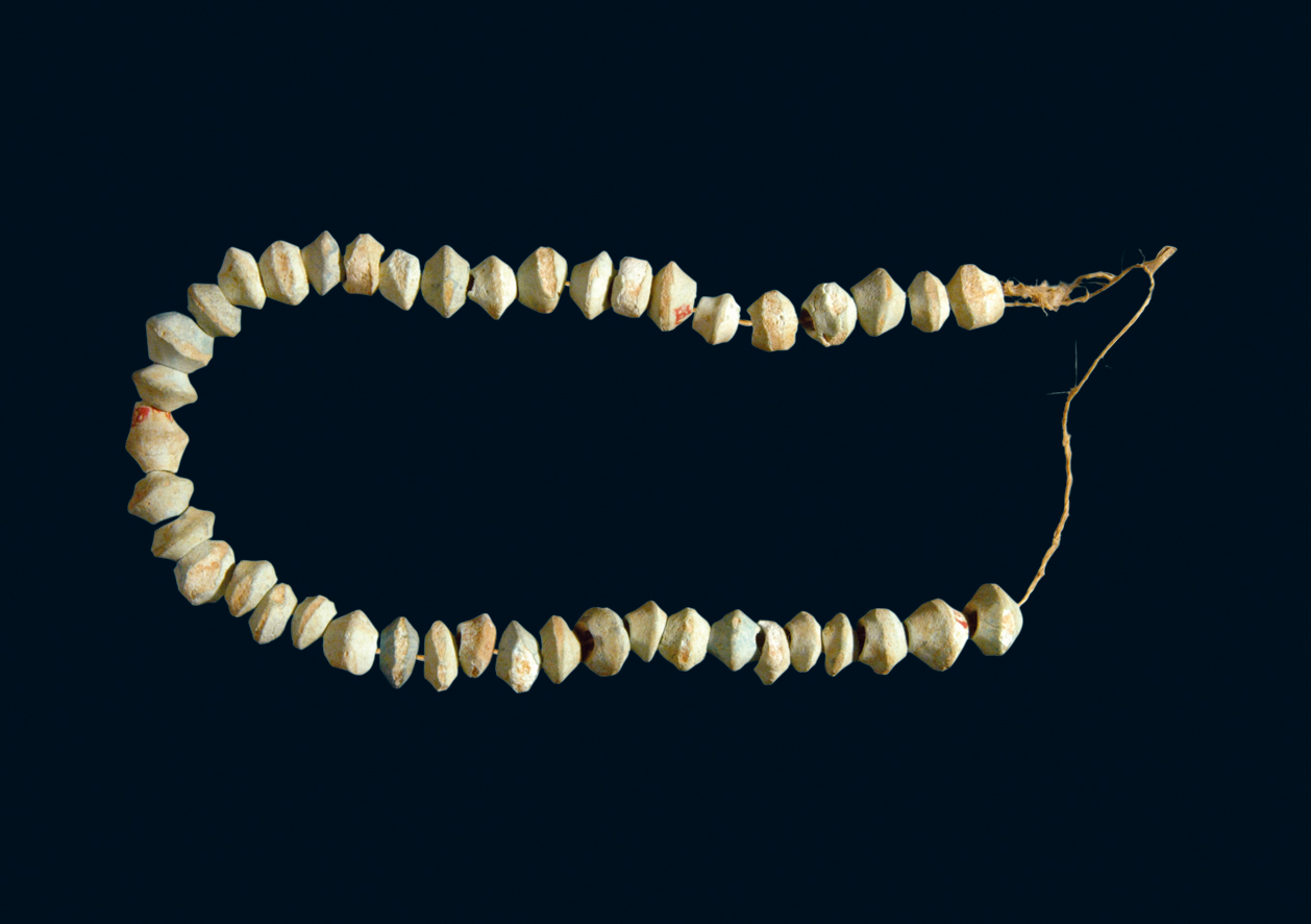 共43枚, 扁圆形珠。绿松石已钙化疏松轻脆, 灰黄绿色, 表面呈灰白色粉皮。