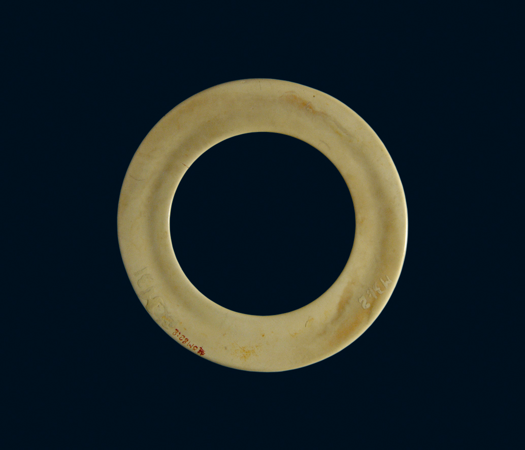 鸡骨白色, 表面光洁滑润。有裂, 残缺, 出土后经粘复。器形扁平圆环状, 内沿向外出棱, 截面呈“T”字形。