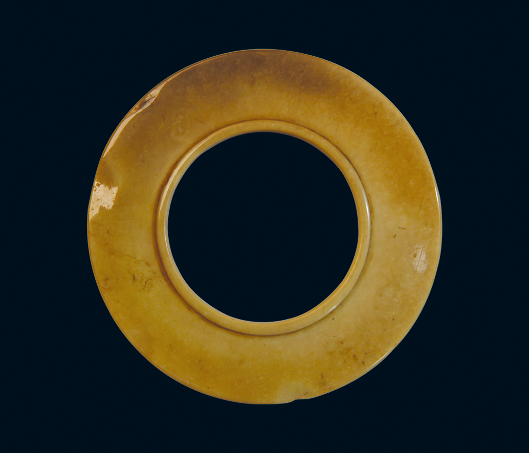 黄褐色至灰绿色。环形, 其璧面较窄, 内缘向两面出棱, 截面呈“T”字形, 器面光洁平整, 有玻璃光泽, 边略有磨缺。