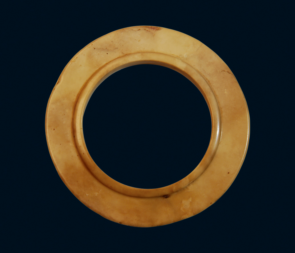 乳白色, 玉质致密, 瓷质光泽, 表面光洁滑润。器形扁平圆环状。