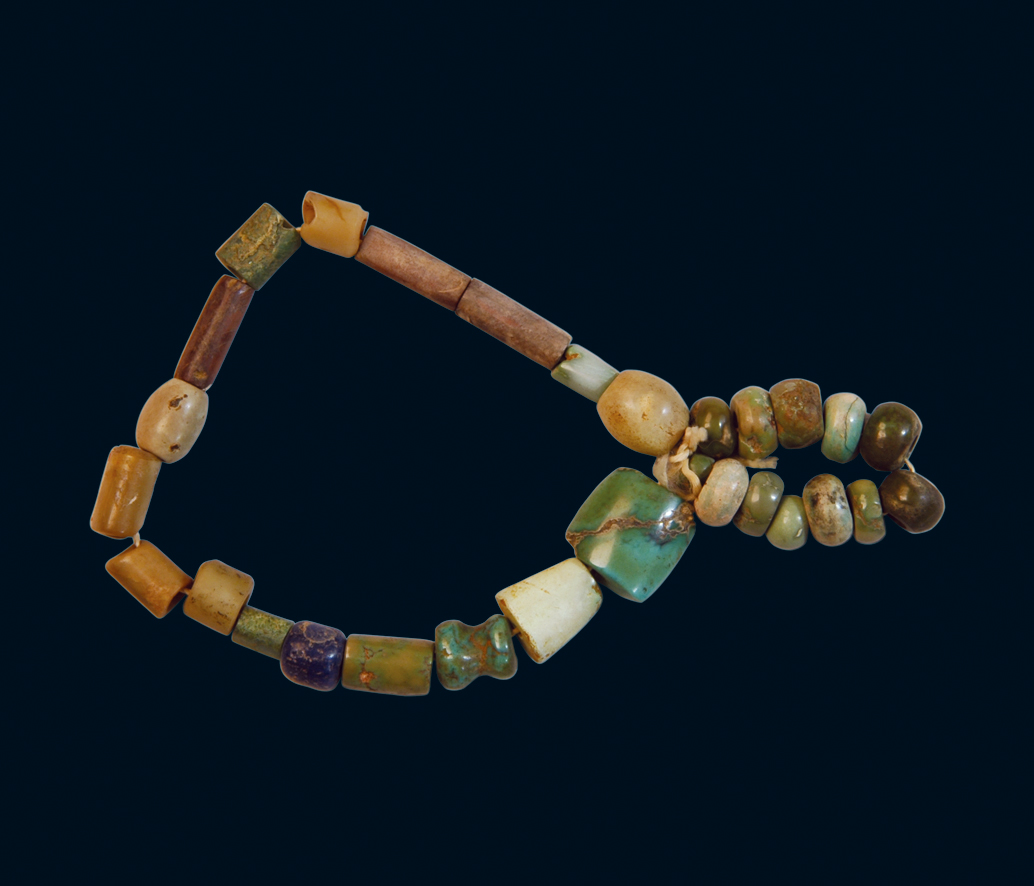绿松石珠20粒, 艳绿色, 质感细腻, 其抛光面较亮。玉珠8 粒, 呈绿色、褐色或鸡骨白。