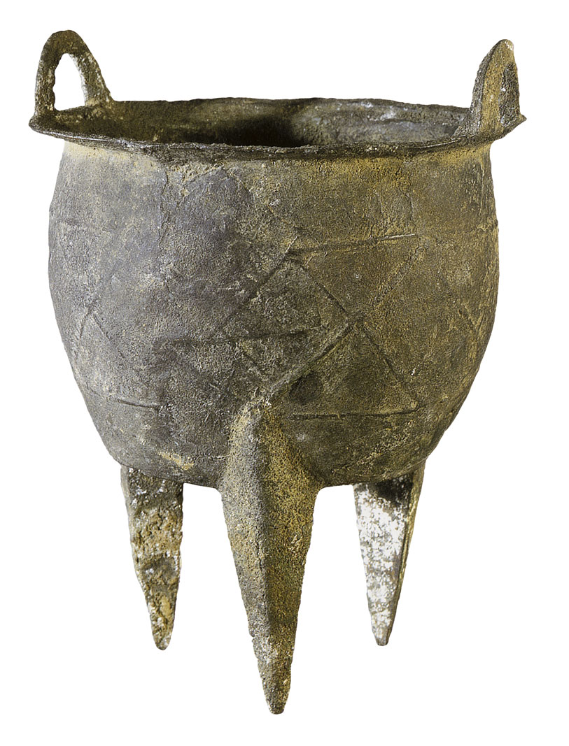 • 造型古拙,平底下接三个四棱空锥足。腹饰斜格纹一周。此鼎是中国目前所见最早的铜鼎