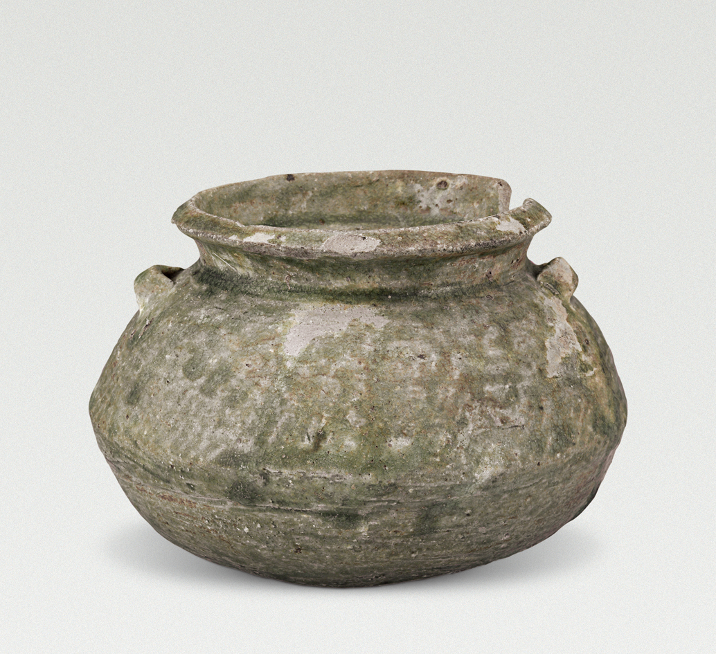 • 尖唇,折沿下斜,矮颈,溜肩,腹部斜折,平底,近颈处有两个小桥形系,颈、肩、腹系三段相接而成。胎色浅灰,胎质较粗、坚硬。外壁满釉,内底心无釉,其余有釉。釉色青绿,釉面较亮,釉层不匀,聚釉处明显泛绿,且有细密的小开片。折腹处以下有半周压印方格纹。