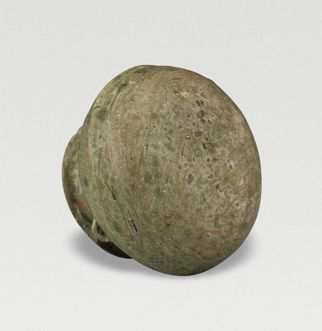 椭圆形口,短束颈,梨形腹,腹部扁平,高圈足。正背面模印相同纹饰,呈浅浮雕状。腹壁正中站立一胡人,左手持物似骨朵,身前两侧蹲坐两只狮子,狮子扭首向前。壶壁两侧模印象首,长鼻垂于底部。联珠纹边框。口部、足壁部分模印联珠纹莲瓣。