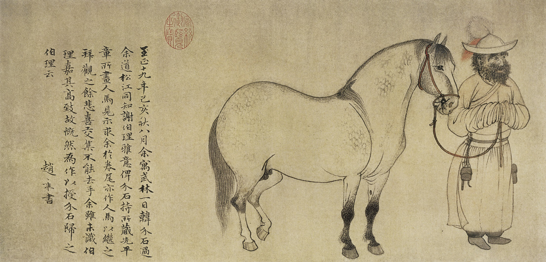 赵雍 (1289—1360后)元代画家。字仲穆。湖州(今浙江吴兴县)人。官至集贤待制,同知湖州路总官府事。承家学,工书善画。山水师董源,尤善画人马竹石,得曹霸之法;书工真行草篆,体势清劲。