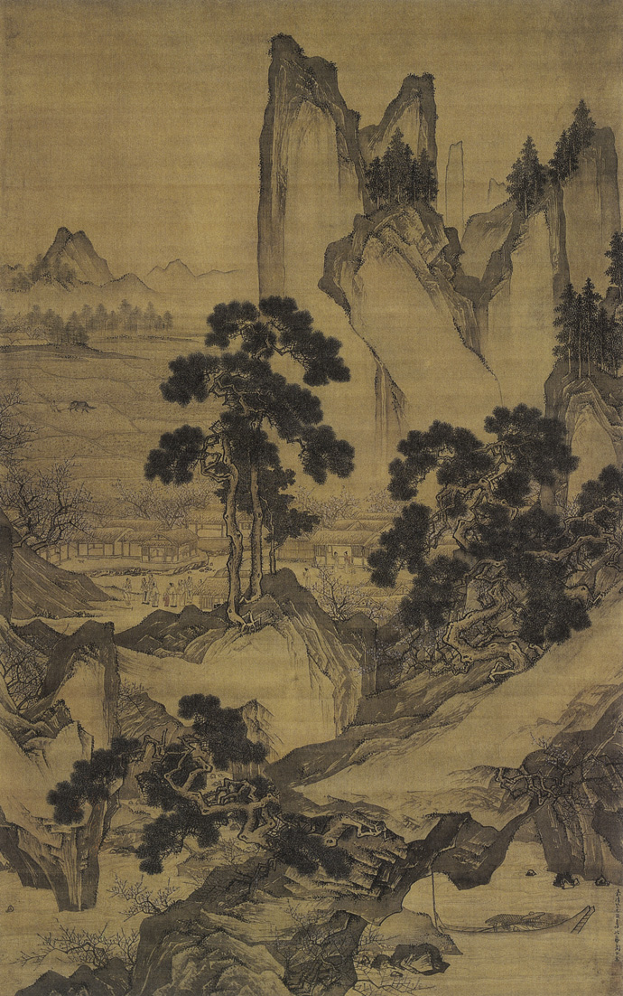 周臣 (1426—1509)明代 今江苏(吴县)人。初学画于陈暹,画山水取法于李唐、马远、夏圭,用笔纯熟,笔力疏秀,峦深岚厚,有苍郁之色,颇得六法深意。他兼工人物,古貌奇姿,纤浓雅丽,绵密萧散、各尽意态。唐寅、仇英均出自其门。后唐寅以画名世,困于应酬,每请东村代笔,故唐寅流传之作,每多周笔, 非具眼力莫辨。