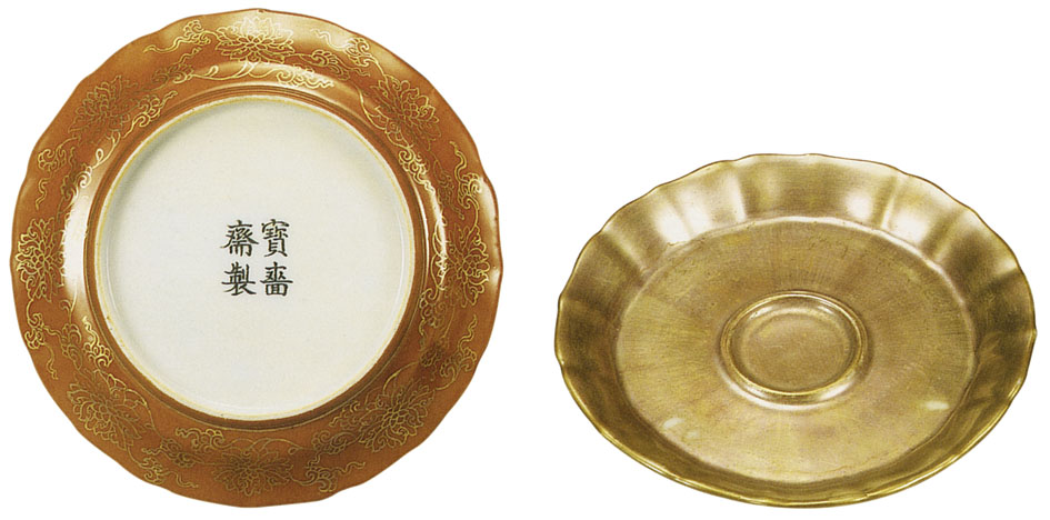 • 口沿呈八瓣菱花形,内壁压出凸筋。里施金彩,外壁珊瑚红釉上绘金彩缠枝莲花。底书墨彩楷书款“宝啬斋制”