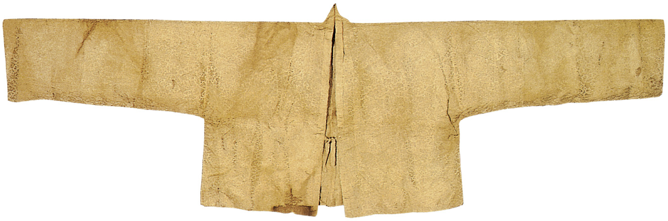 • 对襟式,短身,长袖,两袖平直。面为方格“卍”字纹绸,里为黄绸,中纳丝绵,前胸处有繫带