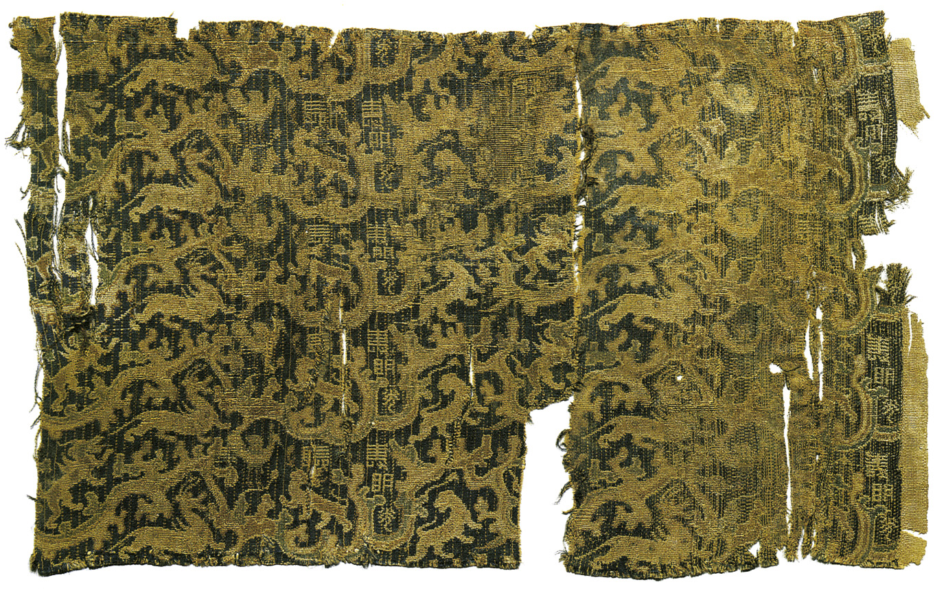 • 靛蓝色地,黄、褐、淡绿三色显花。此织锦图案为姿态各异的猛虎及瑞兽,或昂首阔步,或回头雄视,穿行于变体云纹之中。幅面上夹织隶书“长寿明光”字样