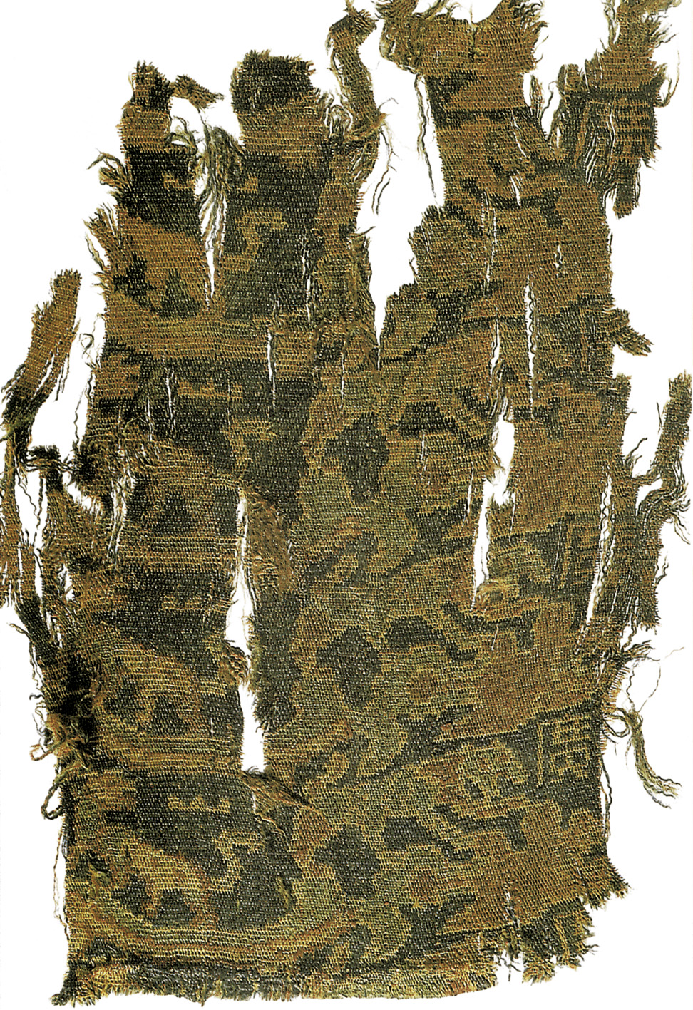 • 靛蓝色地,黄、褐、绿三色显花。此织锦图案为作相背奔走状的虎豹,馀白用变体云纹填充。隶书“广山”二字夹织其中