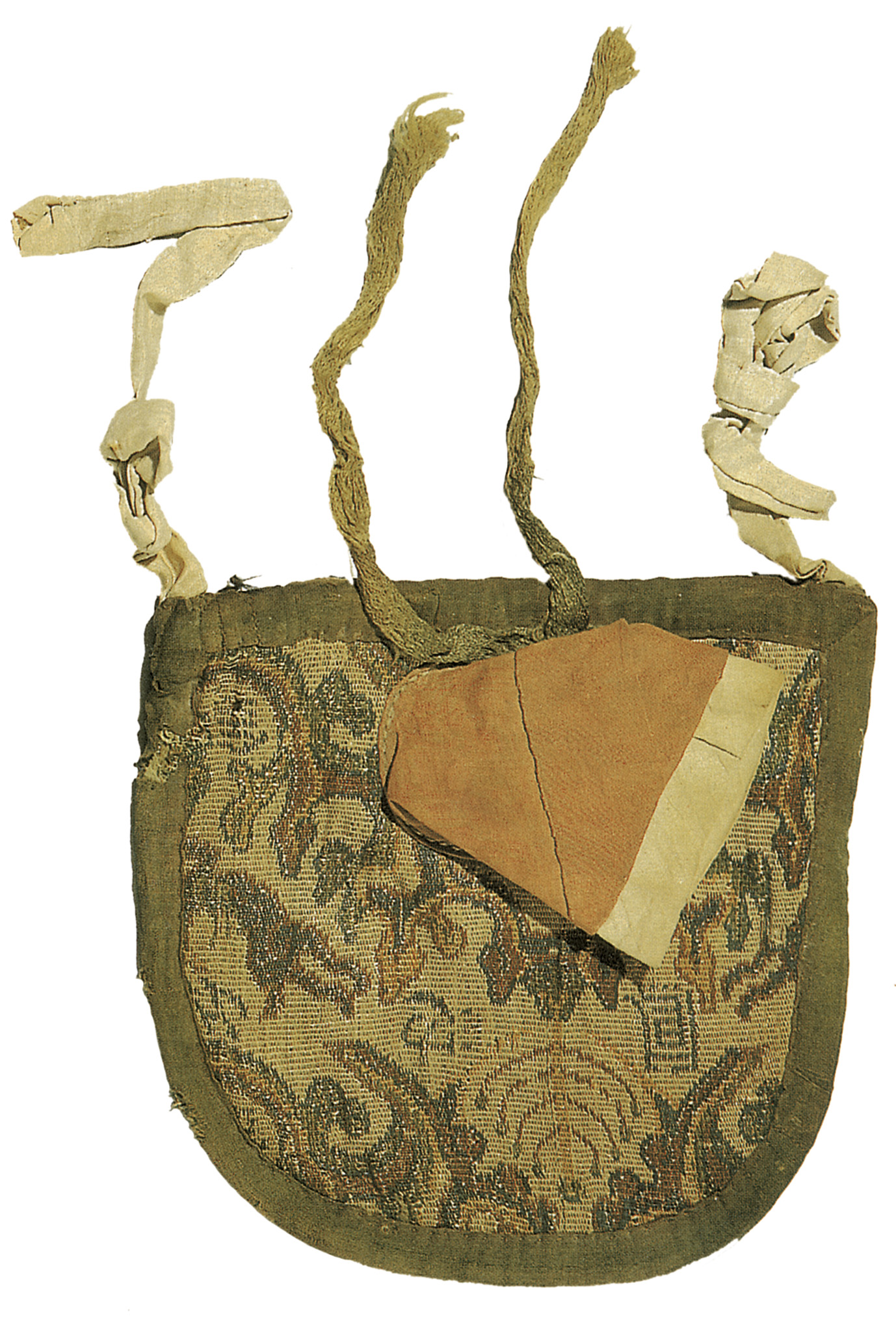 • 为经二重组织。白色锦地,蓝、绿、黄、红四色经线显花。图案为瑞兽纹及植物纹,夹织隶书“金池凤”。袋上缝一附绿色丝线的红绢小袋,两端各缝一根白色绢带