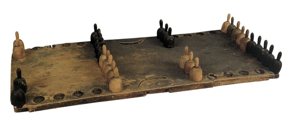 • 由一片长方形“双陆”板与三十粒黑、白双陆子组成。双陆板为木胎,髹黑漆地,相对的两个长边各以白色骨片嵌制十二个圆形“梁”标,并于中间刻一月牙形“门”的标志。双陆子皆平底,束腰尖顶,形制规整