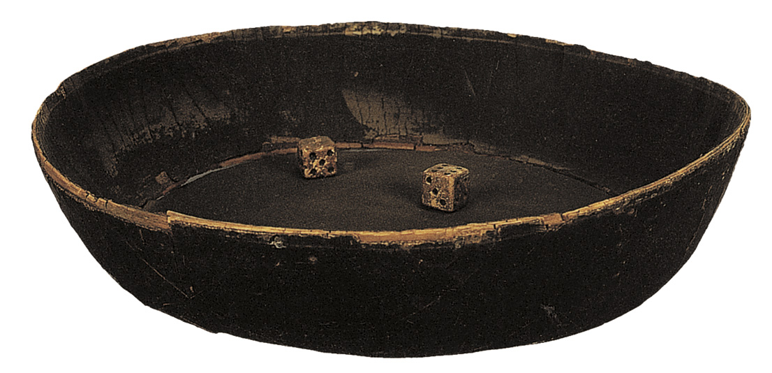 • 由窄木条圈叠成型,贴以粗麻布。通体髹黑漆。口沿有金属扣的痕迹。外底朱书“庚午岁李上牢”六字款。此器为双陆的骰盆,供博戏时掷骰之用