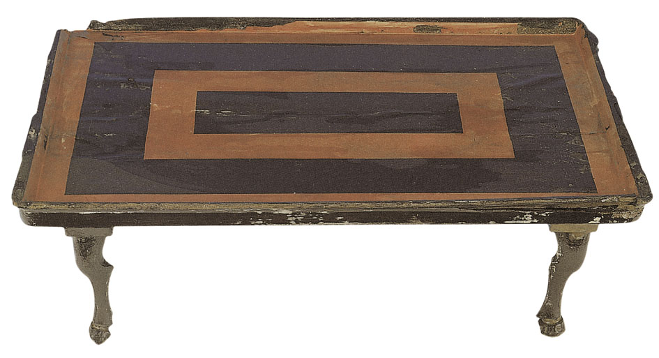 • 木胎。呈扁长方形。边缘微凸且外侈。案下有两竖置长方形木楞,与四蹄足相连。案面朱、黑色漆相间,饰回形纹带,馀皆髹黑漆