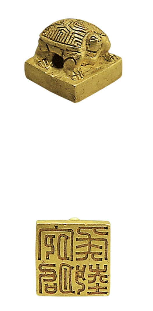 • 龟形钮。钮与印台间有一圆形横穿孔,印面刻阴文“宛朐侯执”四字