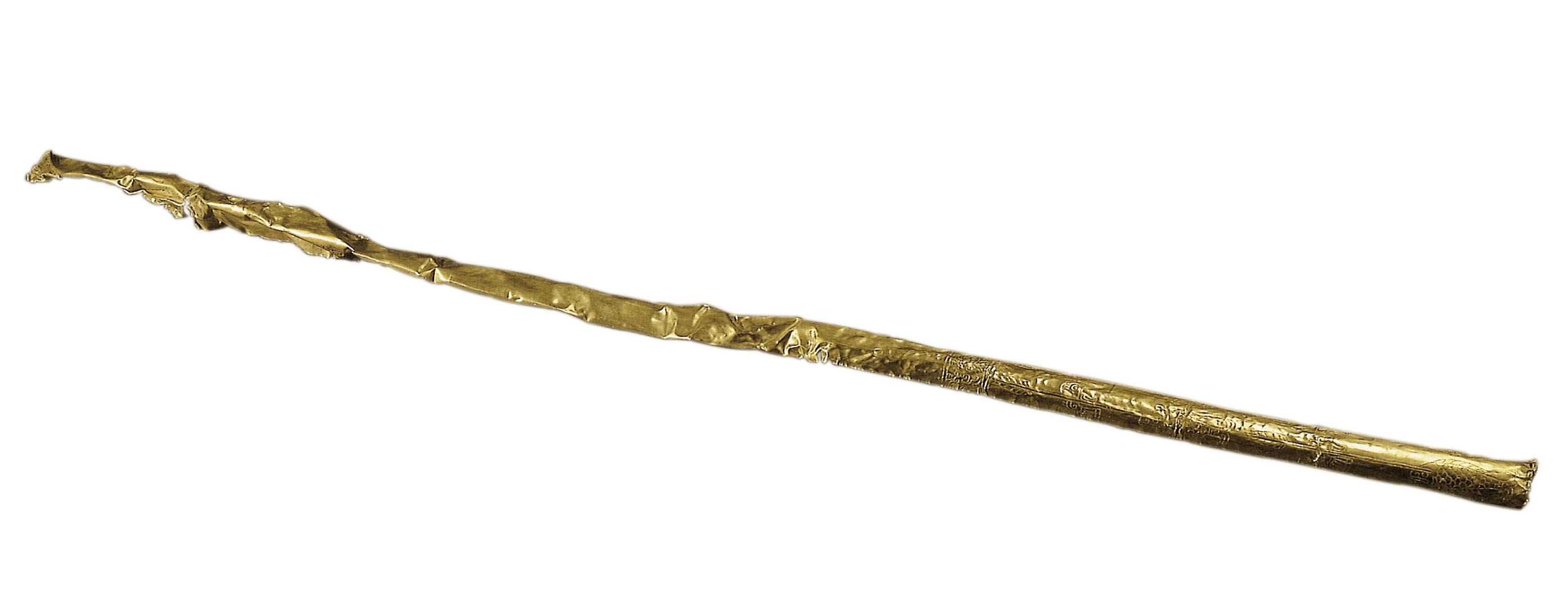 • 金杖系以纯金皮包卷木芯而成,木芯已碳化,杖上有捶打的人头、鸟、鱼等精美花纹图案。此杖的出土对研究古代冶金史和蜀族祭祀礼仪具有重大意义