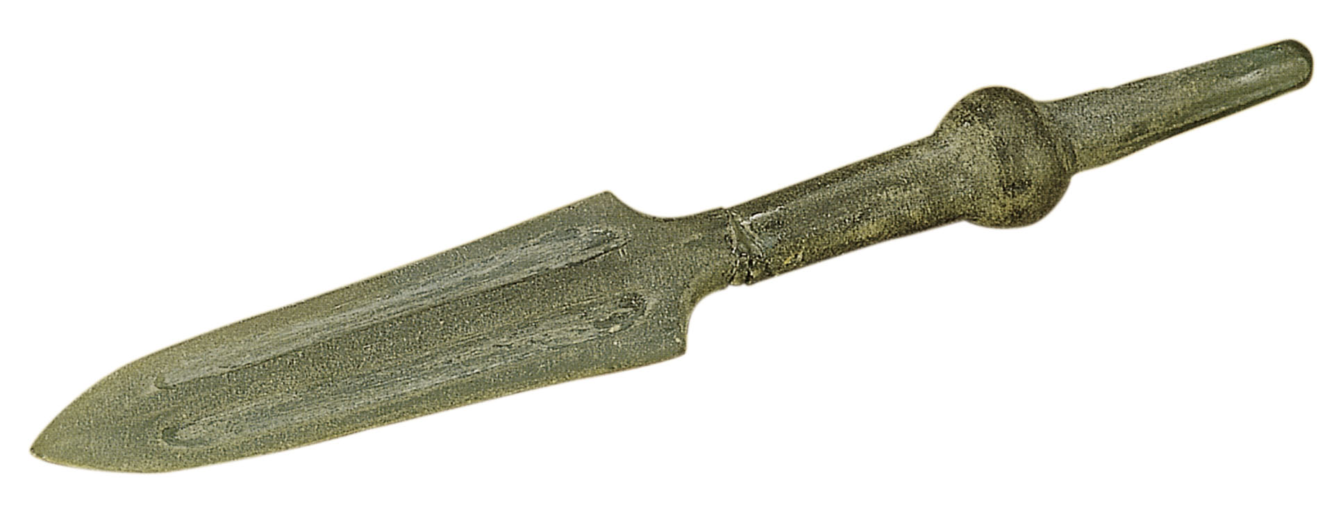 • 模铸成型,造型仿同时期铜矛,呈翠绿色,长骹,中部有球状突起,叶中起脊,两侧有血槽