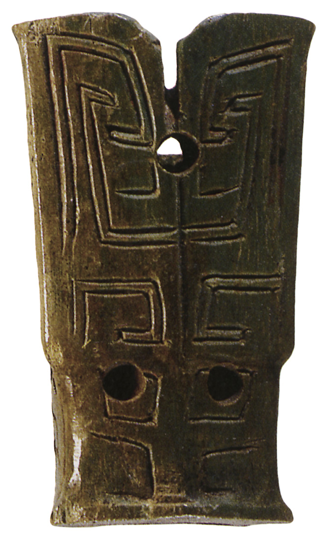 • 器物雕成扁体蝉形,阴刻出蝉身各部分,头部有对称两圆孔,两翼中间有一穿孔