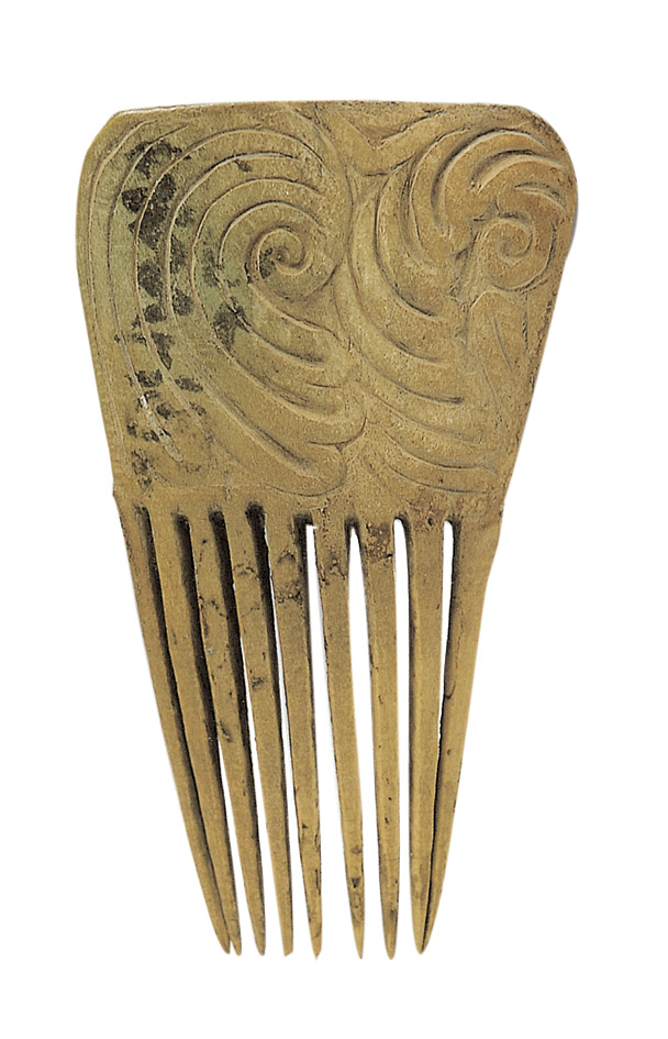 • 磨制而成,近似三角形。柄部正面雕刻两组漩涡纹,背面刻突棱,中穿一小孔。梳共有九齿,皆完好无损