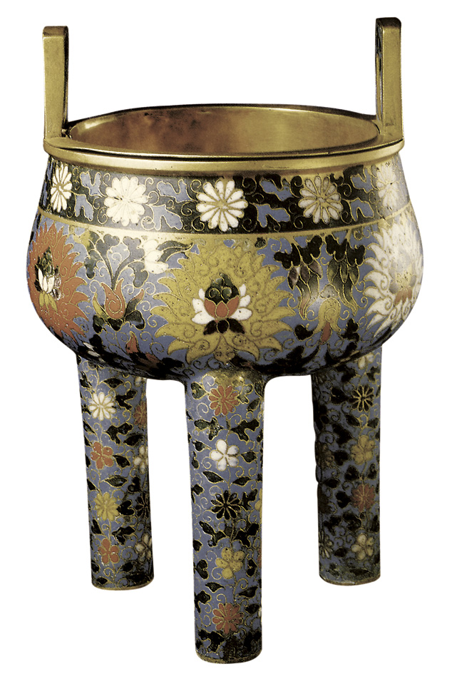 • 镀金,仿青铜鼎,腹上部饰镀金弦纹一周,纹上以墨绿为地饰折枝菊花、白花十二朵;纹下以浅蓝为地饰番莲六朵;三足饰缠枝梅、菊等纹饰