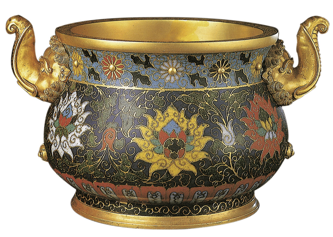 • 镀金,以浅蓝、深蓝色釉为地,掐丝填彩釉为纹,附两铜镀金象鼻耳,颈部饰各色菊花十二朵,腹部饰三色番莲六朵,近足处饰一周莲瓣纹