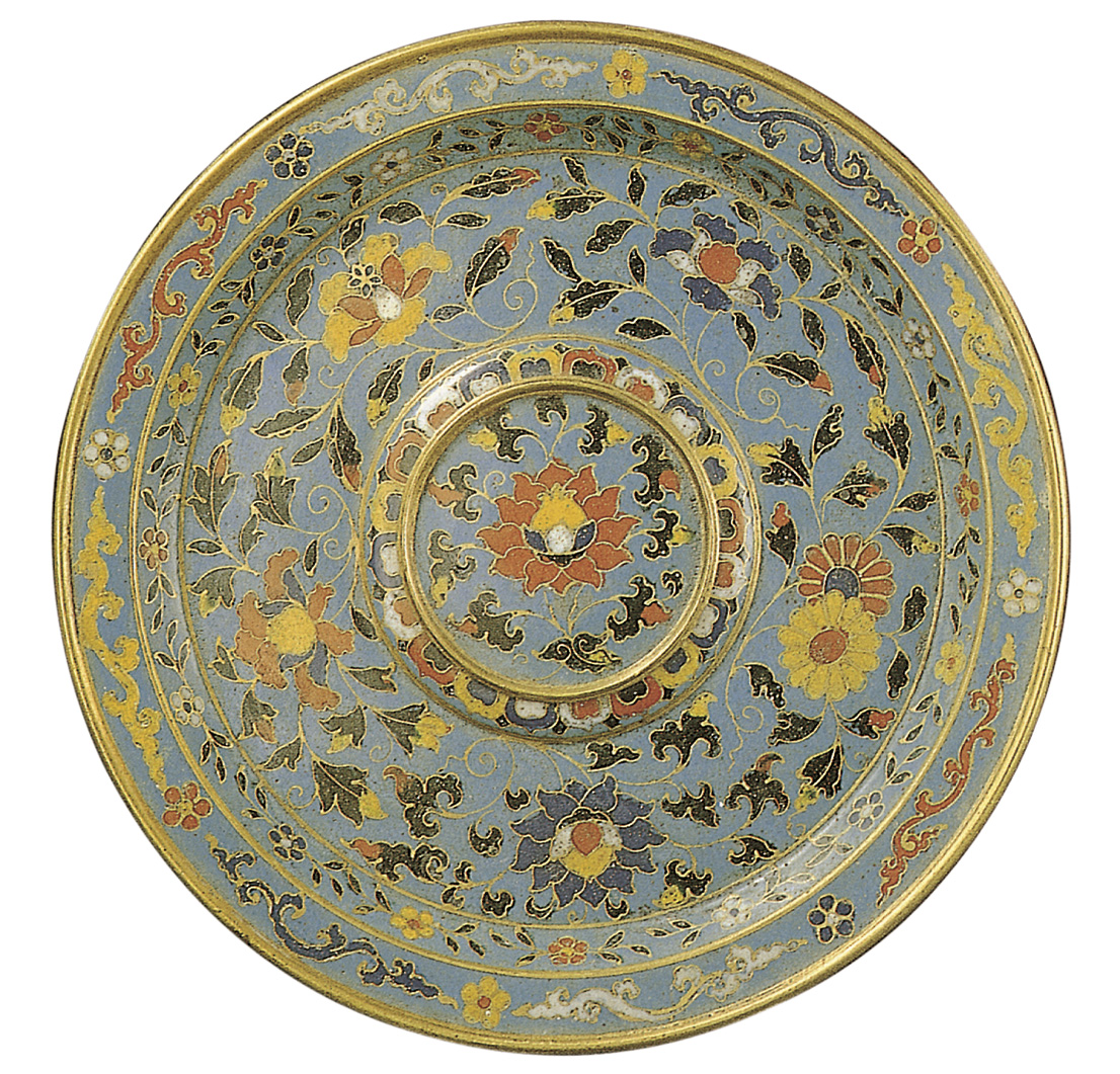 • 镀金,以浅蓝釉为地,掐丝填彩釉为纹,盘心为一环状杯槽,中饰红莲一朵,杯槽上为莲瓣装饰,盘面通饰花卉纹,口沿处为蟠螭纹,盘外壁和底部光素,底中心刻双钩直行“大明宣德年制”楷书款