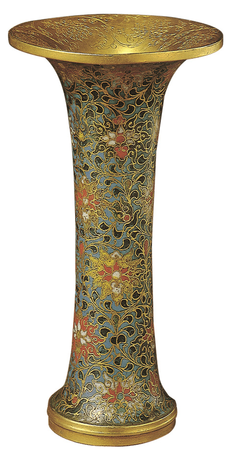 • 镀金,以浅蓝釉为地,掐丝填彩釉为纹,口部錾刻缠枝莲纹,器壁饰花卉图案,下部花间嵌一镀金铜长方形片,上刻“大明景泰年制”楷书款