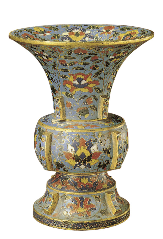 • 镀金,以浅蓝釉为地,掐丝填彩釉为纹,通体饰缠枝花草纹,颈、腹、足部三组出戟,戟上饰五彩圆圈纹,底中心刻十字形杵,靠一边刻横书“大明景泰年制”楷书款