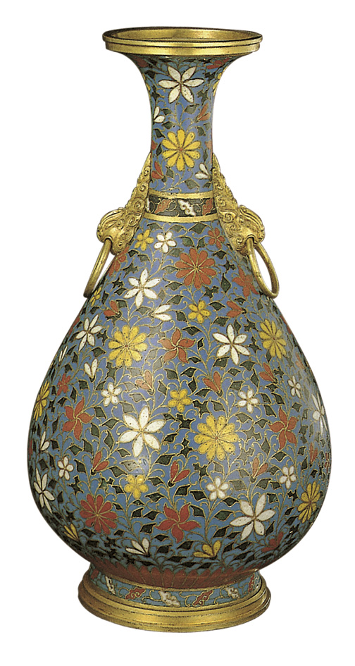 • 镀金,以浅蓝釉为地,掐丝填彩釉为纹,颈部附两兽形铺首衔环,中有金弦纹两道,其间饰紫地五彩灵芝一周,近足处一周红色莲瓣纹,圈足内有“景泰年制”款