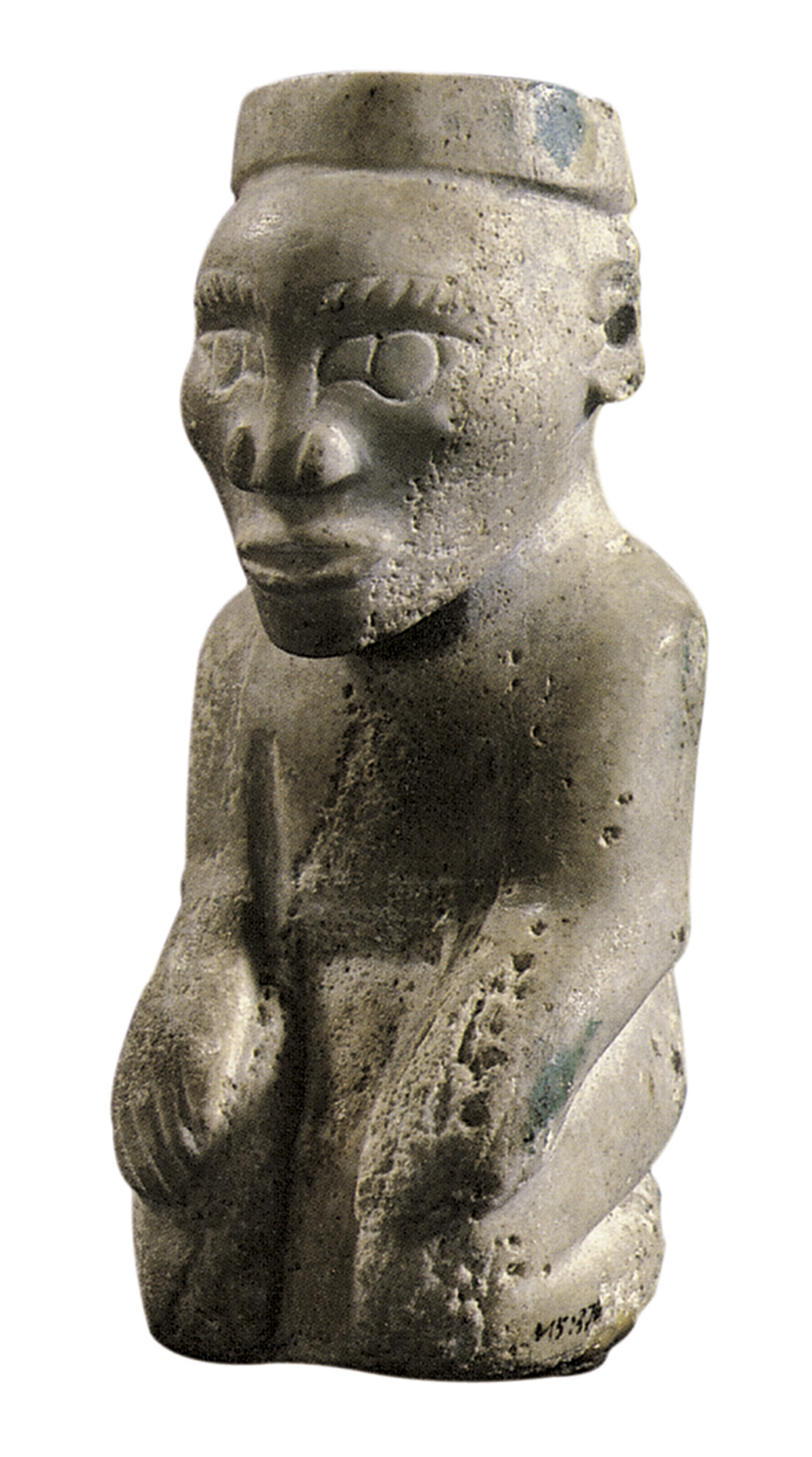 • 向后束发,戴宽“頍”,脸形瘦长,粗眉大眼,高颧骨,大鼻,双唇突出,裸体,腹部垂“蔽膝”双手抚膝跪坐于地