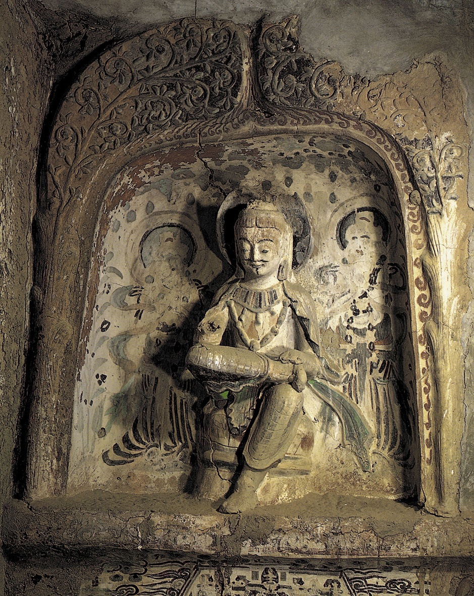 • 龛内菩萨半跏坐于帛座上,圆形头光,身绕帔帛,戴项圈,挂璎珞,作思惟状