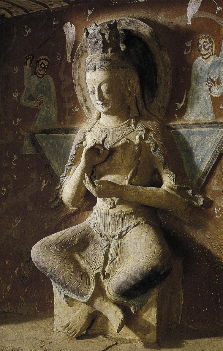 • 龛内塑交脚菩萨,坐于金刚座上,头戴三珠冠,手结转法轮印