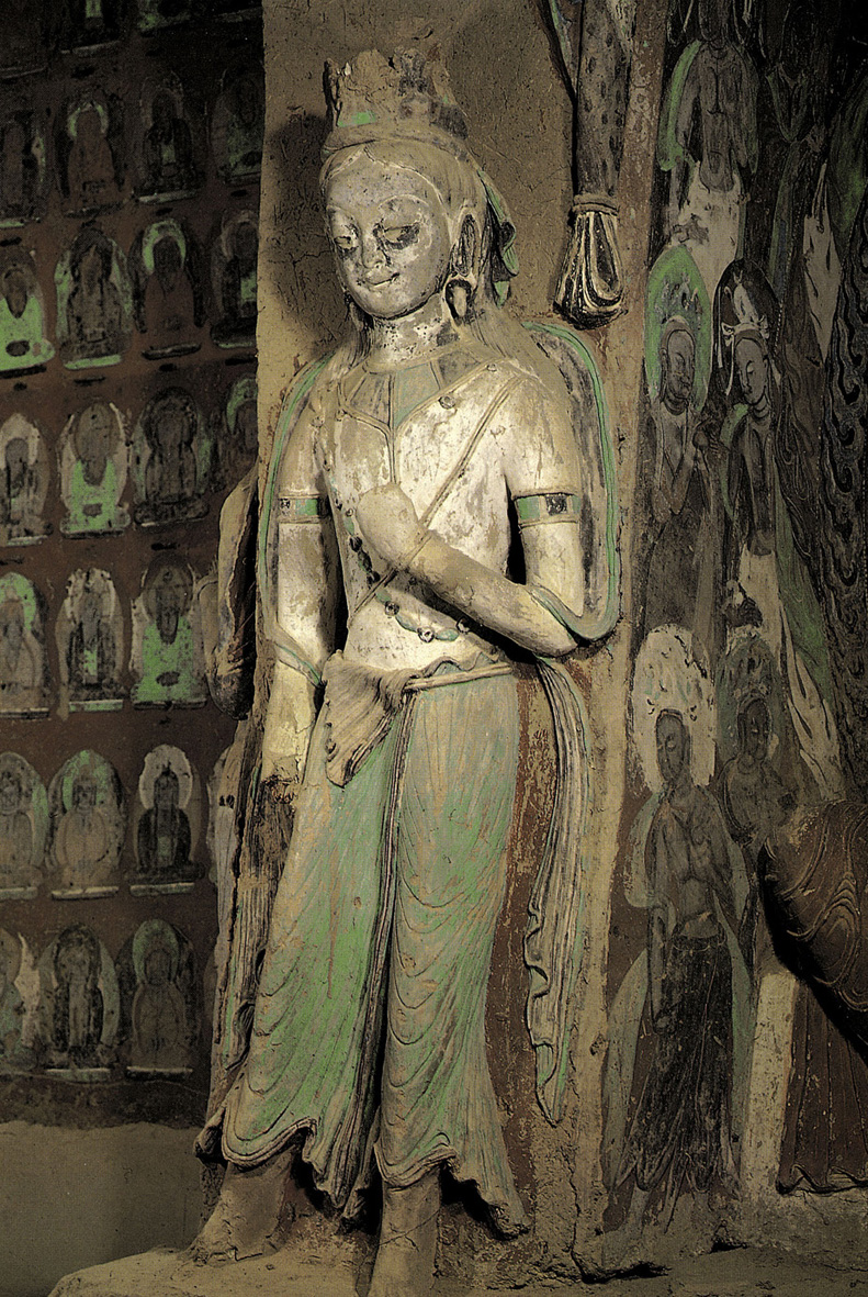 • 菩萨戴冠,长发披肩,戴项圈、臂钏,身绕帔帛,挂长璎珞,下束裙,裙轻薄贴体