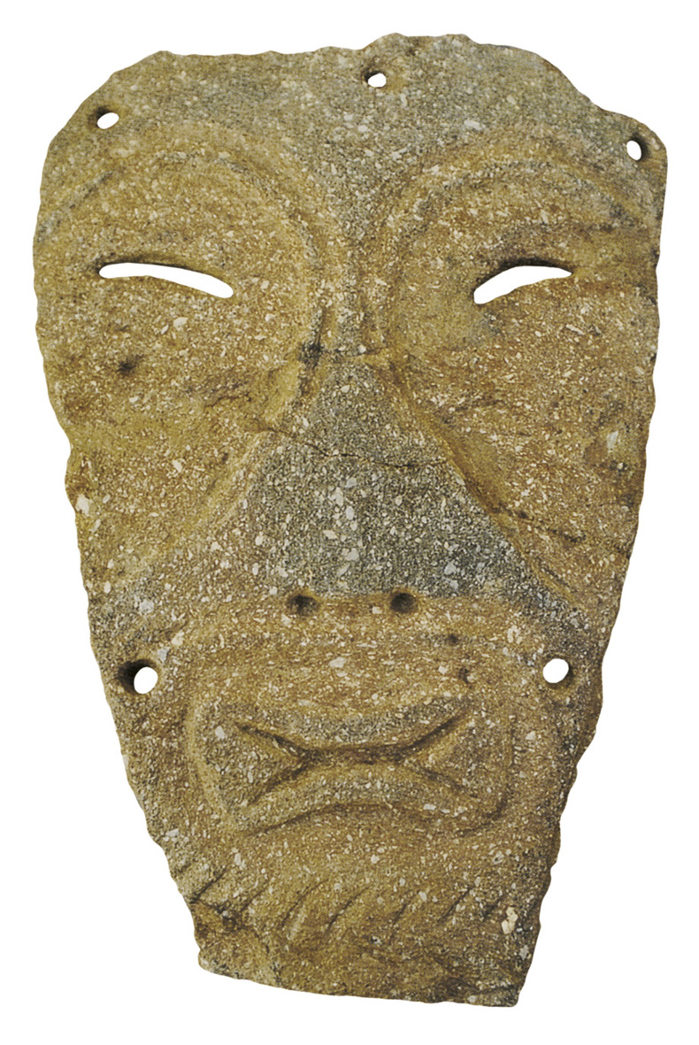 • 用陶片切割制成。以减地阳刻技法刻大眼框和口部等,双眼和鼻孔镂刻。额部和口两旁共有五个穿孔,可穿绳佩戴。此面具应是举行祭祀或巫术活动时使用的假面