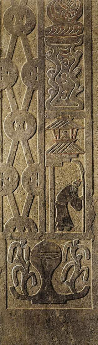• 画面分为上下两层。上层左栏刻绶带穿璧纹,右栏自上而下分别为悬圃、单体重檐阙和执彗门吏图;下层刻博山炉