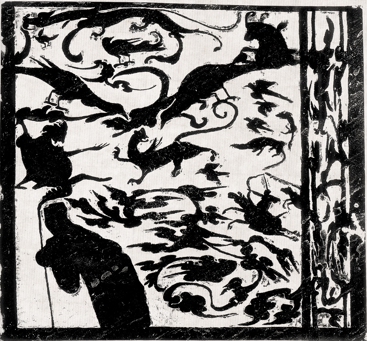 • 画面左下角为一拥彗者,头戴平顶冠,上身前倾站立。天空中饰流云及各种飞禽走兽
