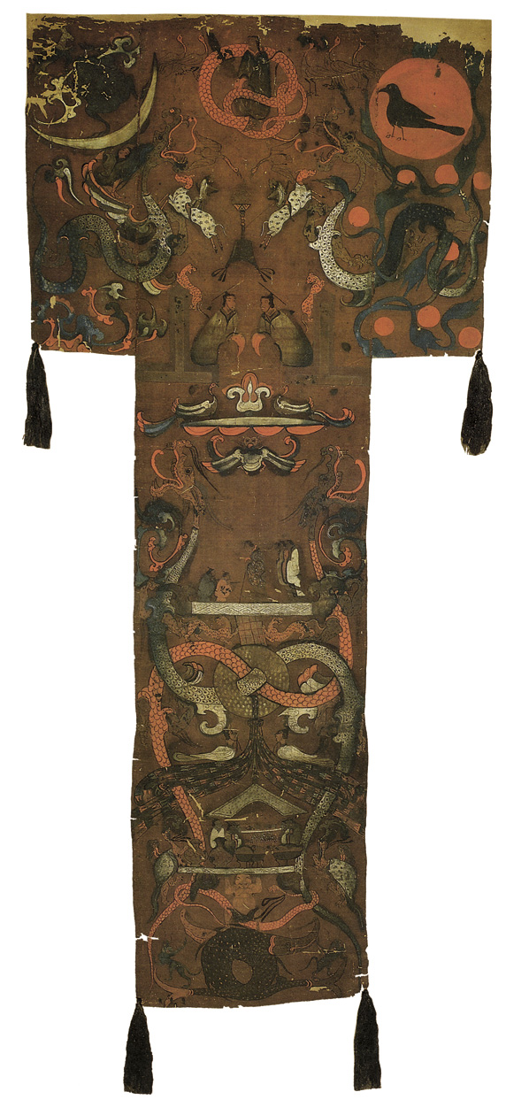 • 《马王堆一号汉墓T型帛画》出土时为覆盖在汉墓的锦饰内棺的盖板上,其应为出丧时作为“遣车”先导所打的“幡”,它表达的是引魂升天之意,体现墓主对羽化登仙的渴望。画面的内容可分上、中、下三部分,分别代表天上、人间和地下。上部描绘的是神话传说中的天国景象。中间画的是墓主人在世时的生活写照。下部绘的是神话传说中的阴间场景。整个帛画画面和协自然,色彩浓烈多彩,富丽华贵,庄重典雅。