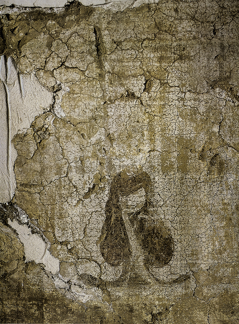 • 图中人物头部模糊不清,身着褐色袍,袍下部呈喇叭口状。此图残损严重